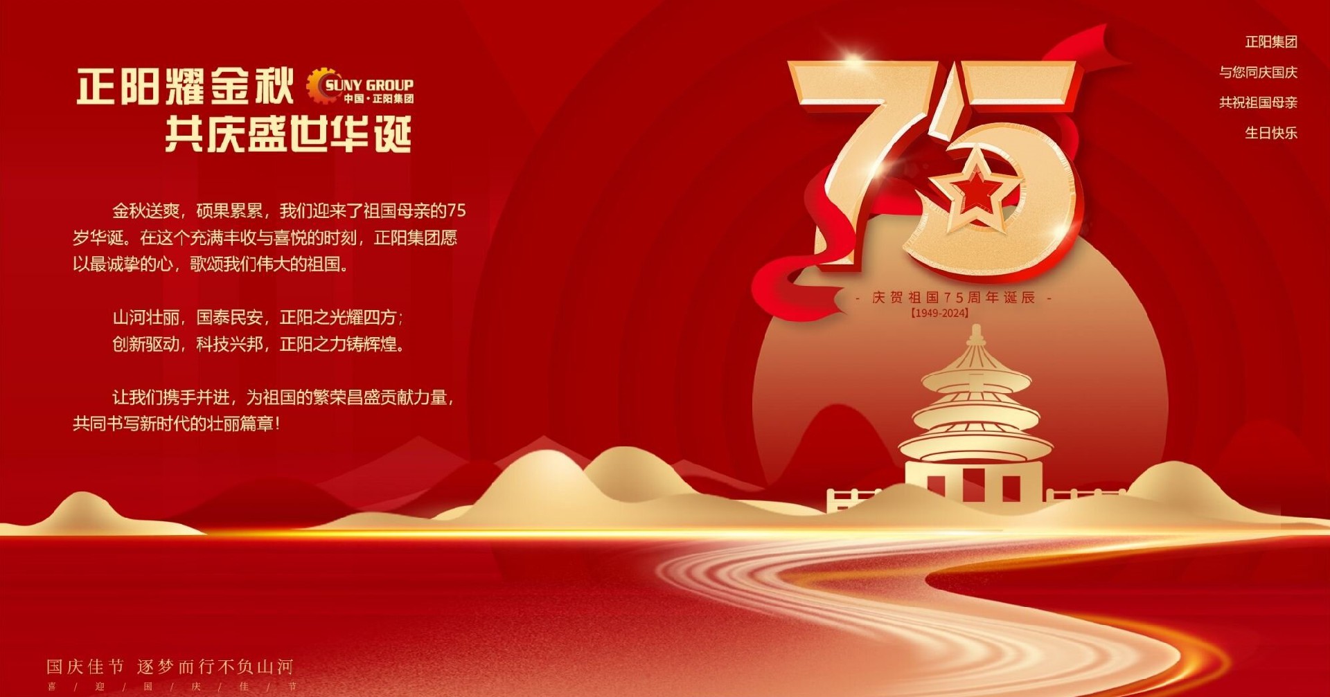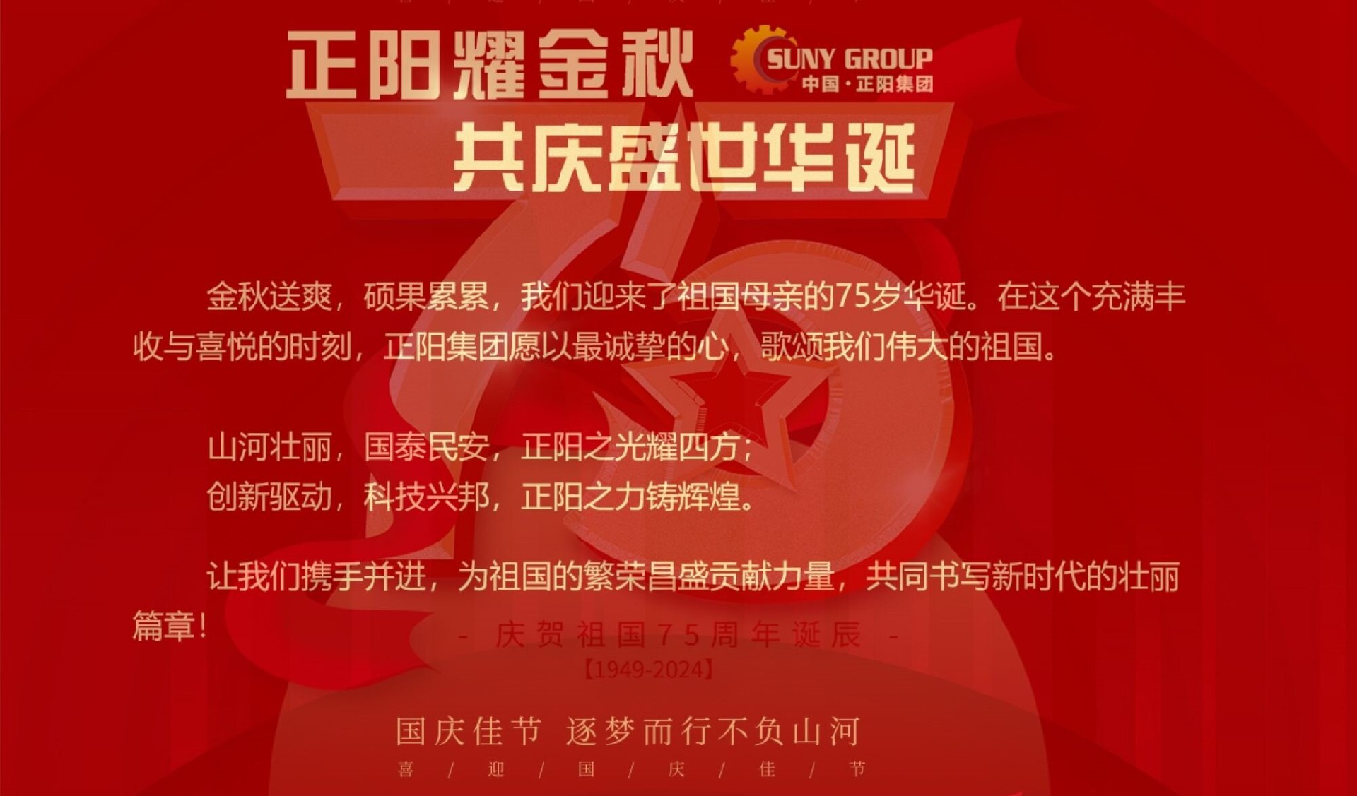 金秋十月,丹桂飄香,我們迎來了中華人民共和國成立75周年的盛大節(jié)日。在這個舉國歡慶的時刻,正陽集團(SUNY GROUP)全體員工與全國人民一道,滿懷喜悅和自豪,共同慶祝這個具有重大意義的日子,向祖國表達我們最誠摯的祝福。